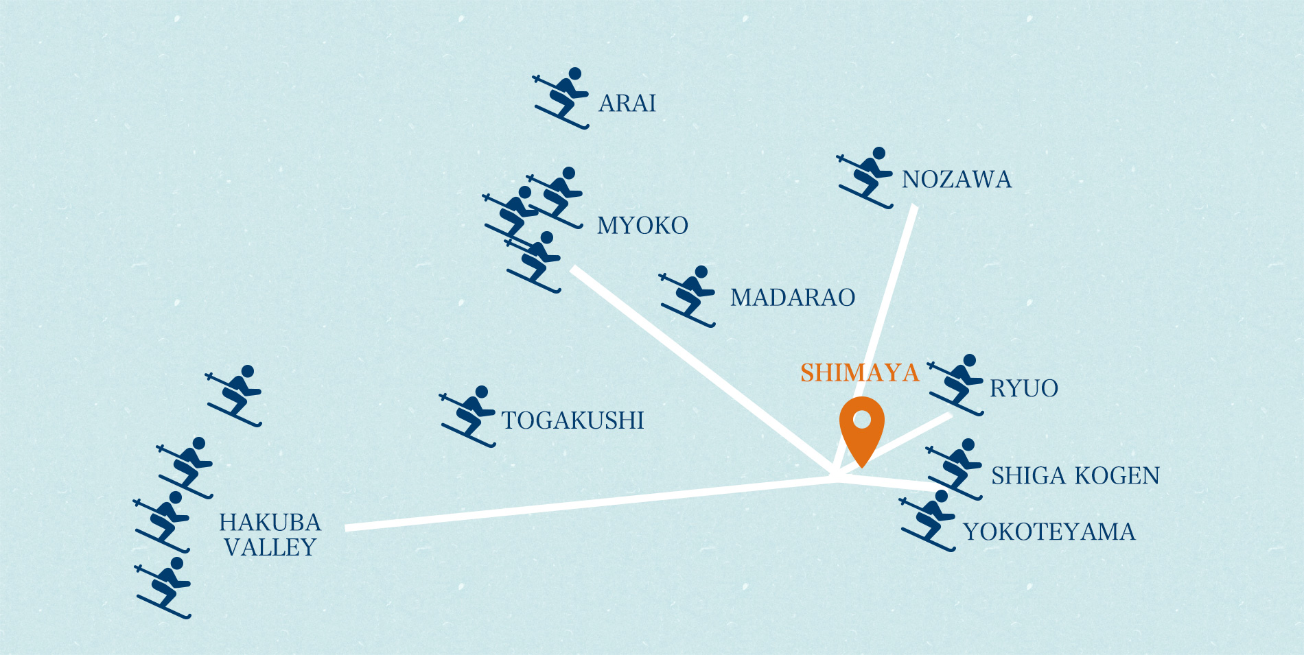 Shimaya is located in northern Nagano Prefecture, with easy access to various ski resorts.